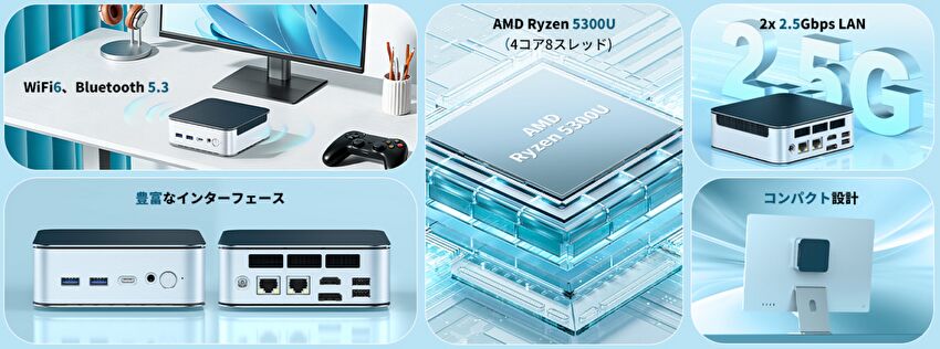 2026年3月28日現在、Amazonにて CPUにAMD Ryzen 3 5300Uを搭載するミニPCが 40,848円で販売されています。Alder Lake N100やTwin Lake N150と競合する、旧世代のRyzenを搭載するミニPCとしては、Ryzen 5 3500U / Ryzen 3 4300Uを搭載する製品が複数販売されていますが、Ryzen 3 5300Uの製品はごく少数です。