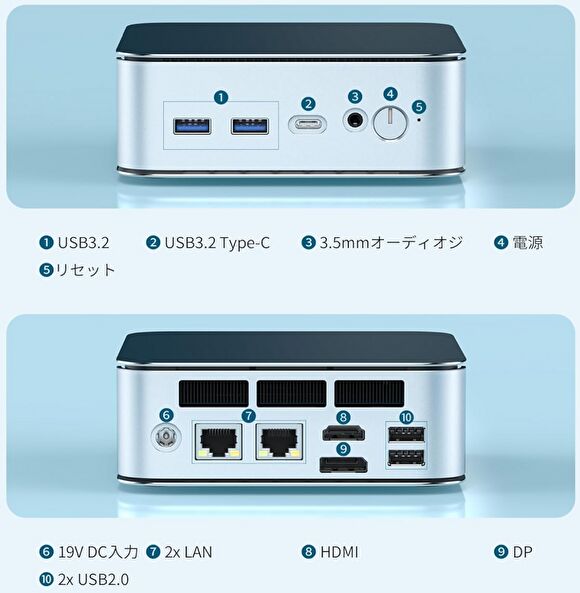 | ポート類 | USB Type-C 映像出力対応、USB-A 3.2 x 2、USB-A 2.0 x 2、HDMI 、DisplayPort、2.5G RJ45 有線LAN x 2、3.5mm オーディオジャック |