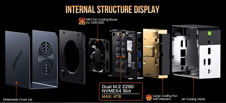GMKtec EVO-X1、Zen5, AMD Ryzen AI 9 HX370を搭載するミニPCの詳細スペック。2つのファンを装備し冷却も万全