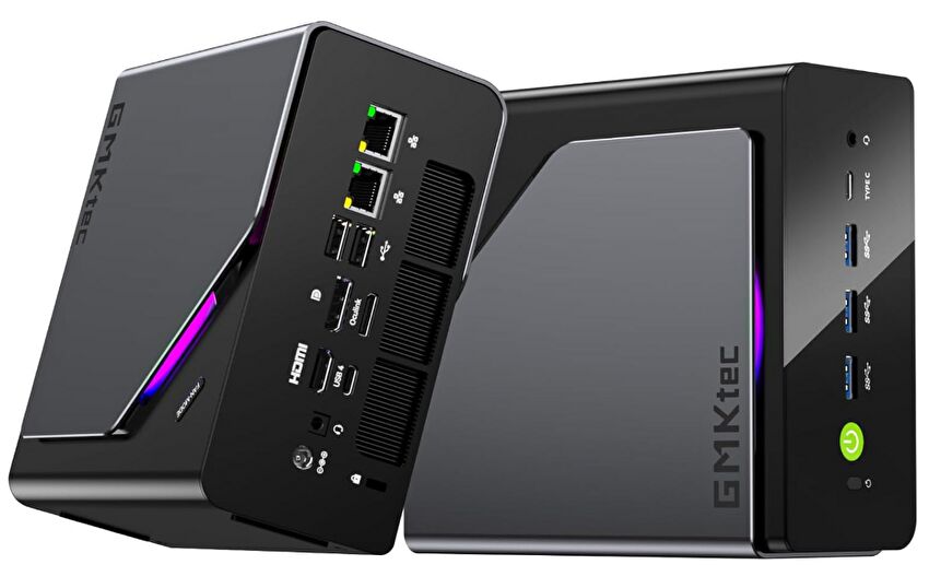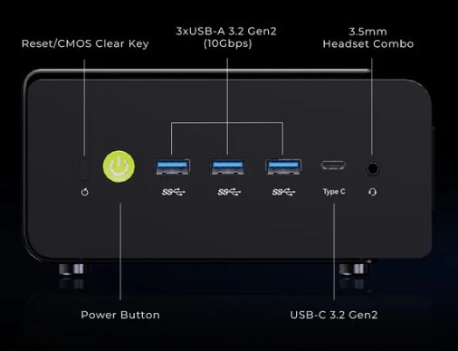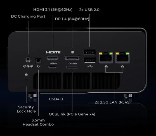 ▼154 × 151 × 73.6 mmと縦横・高さともに 一般的なミニPCよりも 20~30mm大きいこともあり、ポート類は充実しています。映像出力は、前面のUSB-C、背面のUSB4 / HDMI / DPと合わせて 4系統です。USB4のほか、OCulink ポートを装備し、別途 ドッキングステーションを用意することにより、グラボを接続することができます(別途、電源・グラボ・ケーブルが必要)。