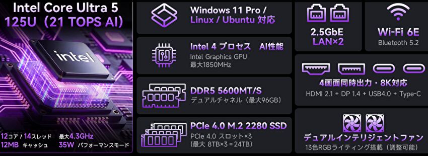 スペックは下表となります。Core Ultra 5 125Uは旧世代でもあり、AI性能は合計最大 21 TOPSと Core Ultra シリーズ2と比較すると控えめです。