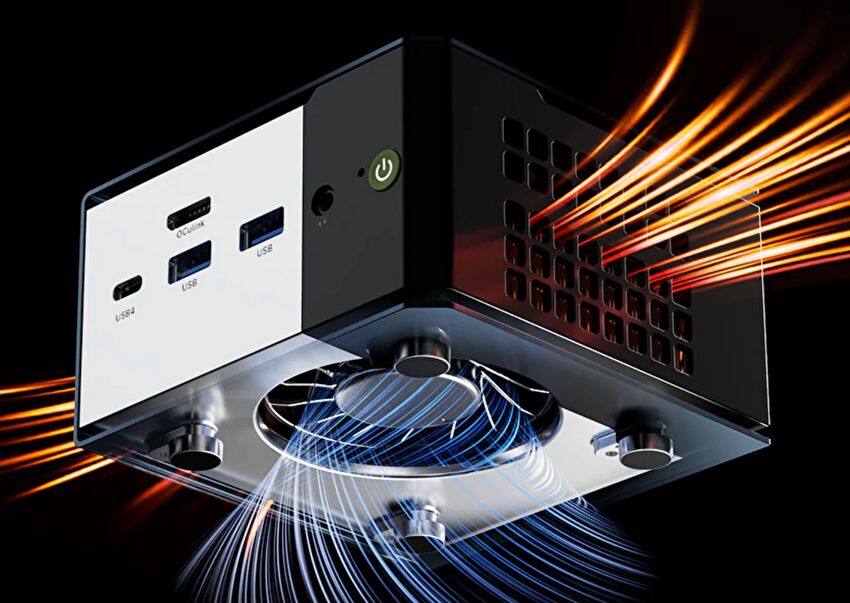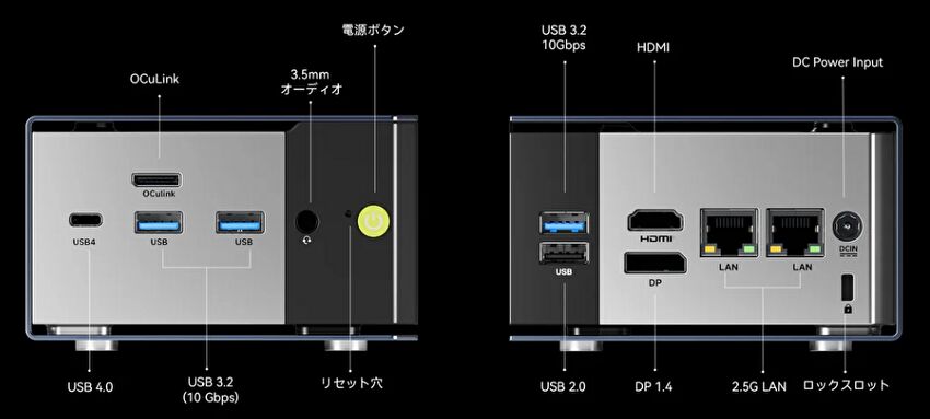 ▲▼107 × 111 × 63 mmと、ミニPCとしてはやや高さのあるサイズです。個人的には、OCulink ポートは背面の配置が好みですが、前面のOCulink ポートを利用し、以下の事例のように外付けグラボを接続することができます(グラボのほかに、別途、電源・ドッキングステーションが必要)。なお、USB4経由においても、外付けグラボを接続することができます。