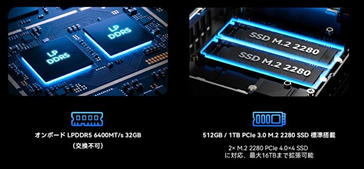 | ストレージ | PCIe 3.0 M.2 2280 SSD 512GB / 1TB、2スロットを装備し 双方ともにPCIe 3.0/4.0に対応 |
