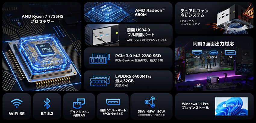 GMKtecより、CPUにAMD Ryzen 7 7735HSを搭載するミニPC「GMKtec K16」が発売となりました。オンボードのLPDDR5 6400MT/s 32GB メモリを搭載、前面にUSB4とOCulink ポートを装備し、PCIe 4.0 SSDを2基搭載することができます(標準装備は PCIe 3.0 SSD)。