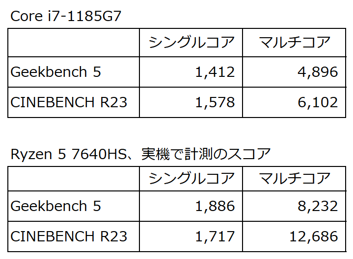 ポイントとなるのは Core i7-1185G7の実力ですが、公式ストアでは同価格帯のRyzen 5 7640HS・上の記事にて実機レビューの「MINISFORUM UM760 Slim」で計測のベンチマークスコアと比較してみました(Core i7-1185G7のスコアは、海外サイトからの引用です)。シングルコア・マルチコアともに Ryzen 5 7640HSが大きな差をつけ高いスコアです。