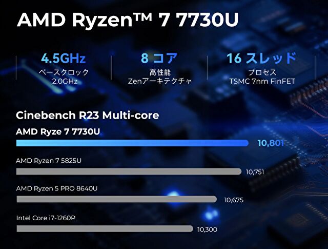 | CPU | AMD Ryzen 7 7730U、Zen 3 アーキテクチャ、8コア16スレッド、最大 4.5GHz |