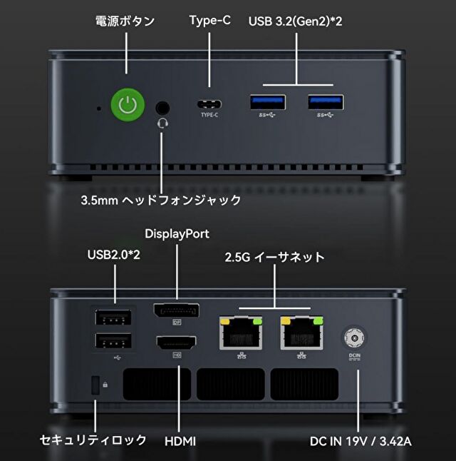 ▼前面にフル機能のUSB-Cを搭載し、映像出力は USB-C、HDMI、DisplayPortの3系統です。なお、GMKtecのミニPCでは搭載事例の多い OCulink ポートを未装備であることに留意ください。