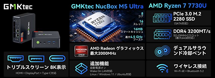 GMKtecより、CPUにAMD Ryzen 7 7730Uを搭載するミニPC「GMKtec M5 Ultra」が販売されていますので、スペックと特徴について記載します。