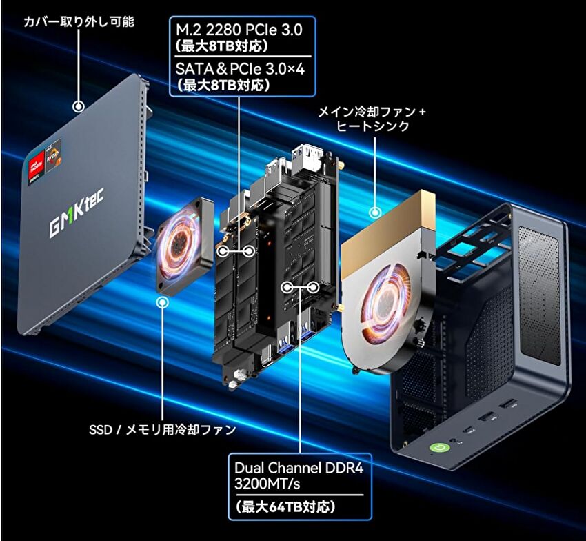 ▼下表はメモリ 16GB / SSD 512GBのセットモデルですが、メモリ 32GB / SSD 1TBのモデルも販売されています。GMKtecのセットモデルに多い仕様ですが、M.2 SSDは PCIe 4.0ではなく PCIe 3.0 SSDを標準装備していることに留意ください。