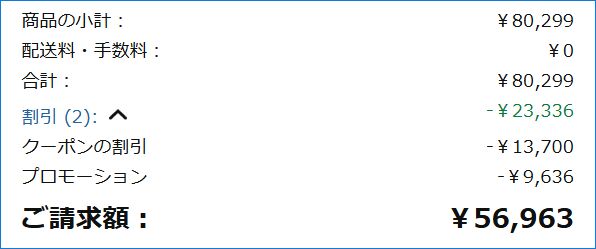 メモリ 16GB / SSD 512GBモデルの場合、2025年2月7日現在のAmazonでは以下の画像のとおり、表示の価格 80,299円に、クーポン+注文時の12%割引により 56,963円での販売です。