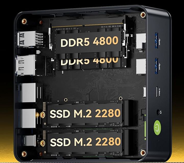 ▼映像出力は、USB4とHDMI、DisplayPortの3系統。惜しい事項としては、GMKtecのミニPCでは搭載事例の多い OCulink ポート(外付けグラボをUSB4経由よりも速い転送速度で接続可能)を未装備であること。