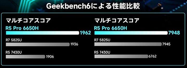▲▼AMD Ryzen 5 PRO 6650Hの実力ですが、Geekbench 6のスコアは「シングルコア 1962、マルチコア 7948」と公開されています。上の画像では、Ryzen 7 5825UとRyzen 5 7430Uとの比較ですが、以下の記事にて実機レビューの Ryzen 7 7735HSのスコアは「シングルコア 2049、マルチコア 7865」となり、近い水準と言えそうです。