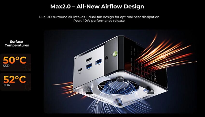GMKtec EVO-X1、Zen5, AMD Ryzen AI 9 HX370を搭載するミニPCの詳細スペック。2つのファンを装備し冷却も万全