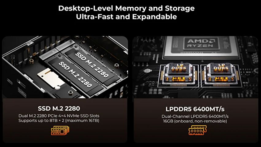 ▲▼他社のこのクラスのミニPCとしては事例は多くないのですが、USB4とOCulink ポートを装備しています。OCulinkはホットスワップに未対応であるものの、GMKtec あるいは以下事例のドッキングステーションの利用により、外付けグラボを接続することができます。
