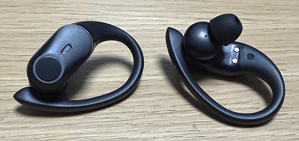 ▼写真はややボケてしまいましたが、他の耳掛け式と同様に耳掛け部分は柔軟性があります。円形の艶ありブラックの部分が物理ボタンですが、大きなボタンで操作性は良好です。