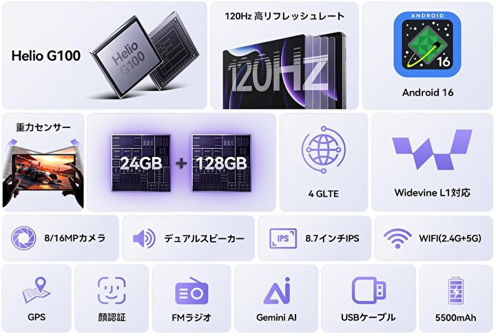 | その他 | Netflixも含めた Widevine L1に対応、GPS搭載、2スピーカー、顔認証に対応 |