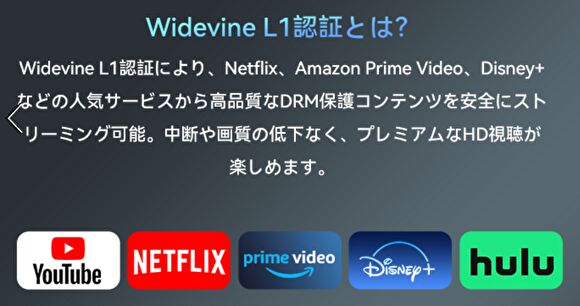 ▼動画配信サイトの動画を高画質再生可能な「Widevine L1」に対応しています。以下の画像のとおり、配信サービスのロゴがあると同サービスに確実に対応しており、Netflixにも対応しています。