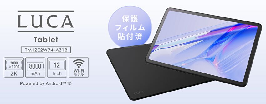 アイリスオーヤマの「LUCA」シリーズの製品、型番は「TM12E2W74-AZ1B」です。上の画像のように「保護フィルム貼付済」と大きく記載されています。ただし、私の認識では(これまでに実機レビューした、10台以上のAndroid タブレットでは)概ねどの製品も保護フィルムは貼付済であり、メリットと記載するにはやや弱いです。