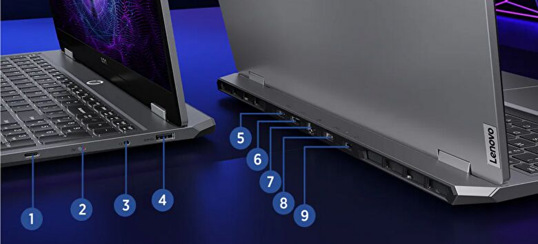 ▼15.6インチ 重量 約2.38kgのゲーミングノートPCでもあり、USB-A x 2(⑤と⑧)、電源コネクタ(⑨)、HDMI(⑥)などはヒンジ側に配置されています。なお、USB4 / Thunderbolt 4を未装備ですが、右サイドの①は映像出力に対応のUSB Type-Cです。また、USB Tpype-Cは、Lenovo 製品情報に「140WのType-C充電に対応」との記載もあります。