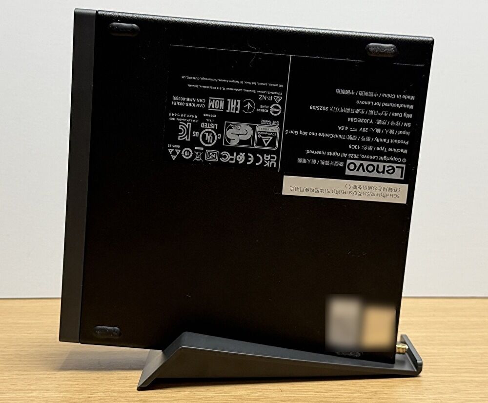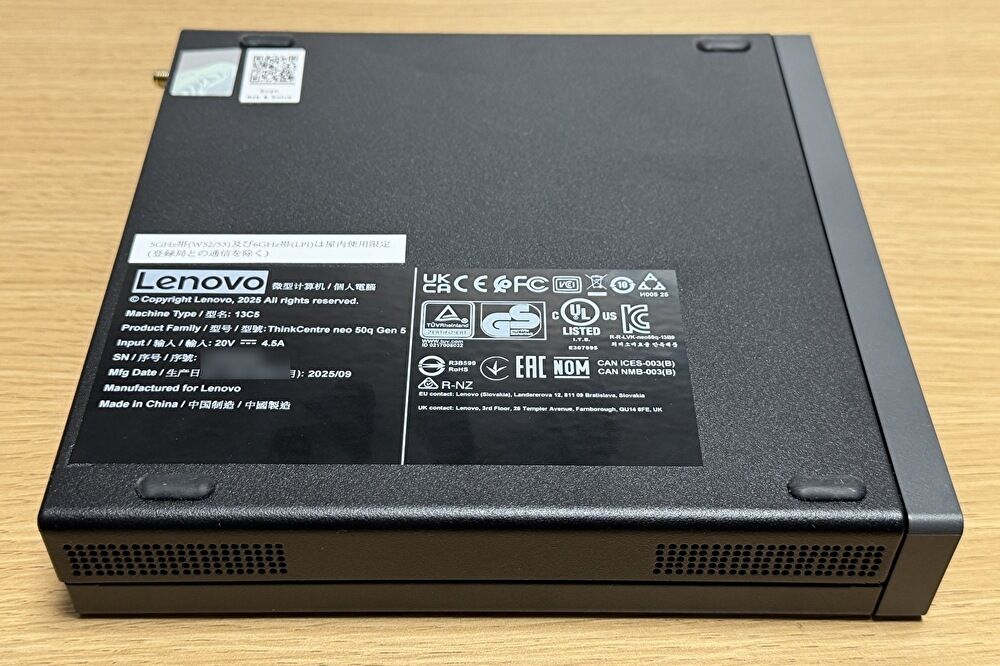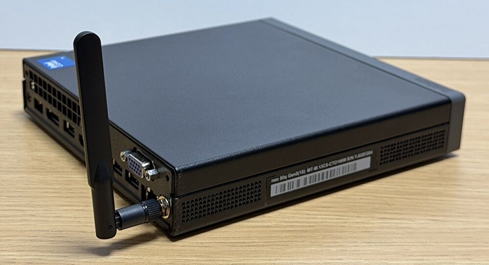 今回実機レビューする製品は、CPUにCore 5 210Hを搭載する「Lenovo ThinkCentre neo 50q Tiny Gen 5」です。約 179 x 182.9 x 36.5mmのスリムな筐体に、メモリとM.2 SSDを2スロット搭載しています。