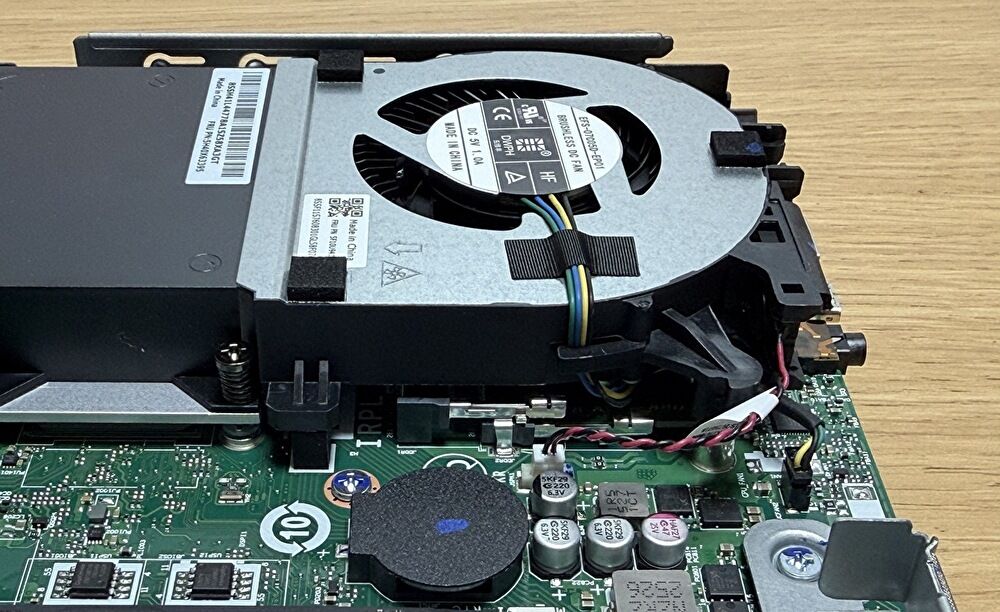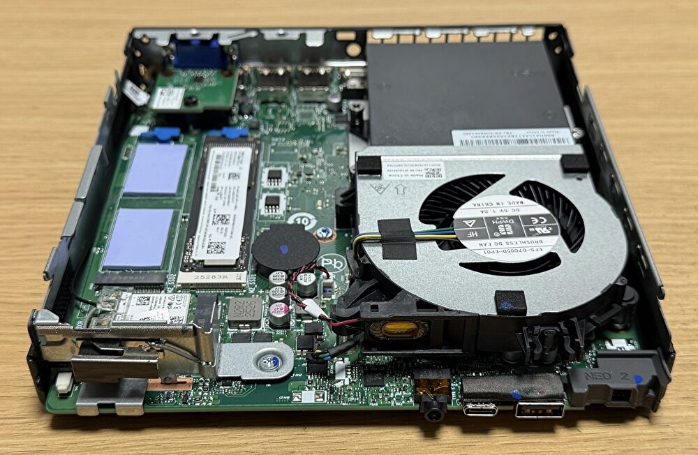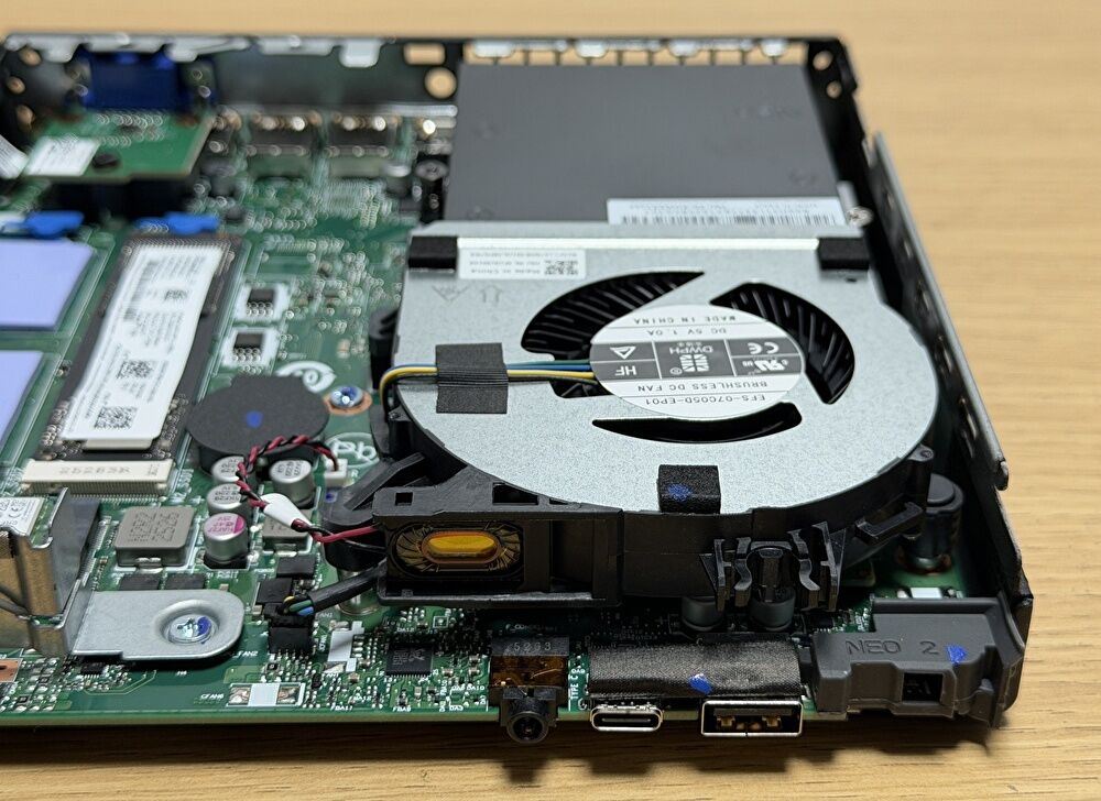 ▼内部、基板の全体像です。左に2つのM.2 SSD スロット、右側にCPUファンとヒートシンクがあります。メモリスロットは CPUファンの下にあり、メモリの増設・換装を行う際にはファンを外す必要があります。厚み36.5mmと薄い筐体ですが、写真の左半分は余裕があります。