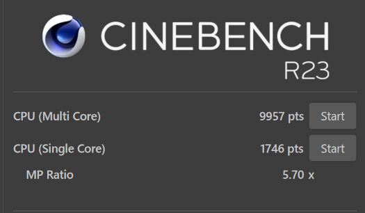 CINEBENCH R23のスコアは「シングルコア 1746、マルチコア 9957」。シングルコアは Core i5-13500Hよりも高い一方、マルチコアは大きな差があります。