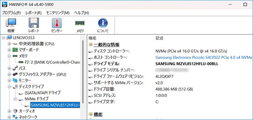 ▼M.2 SSD 512GBは「SAMSUNG MZVL8512HFLU-00BLL」。単体での販売情報を検索できませんでしたが、2280サイズのPCIe 4.0 x 4です。
