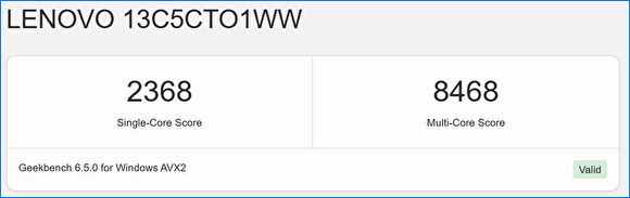 Geekbench 6のスコアは「シングルコア 2368、マルチコア 8568」。Core i5-13500Hと比較すると、マルチコアはが控えめであることは、Geekbench 5と同傾向です。