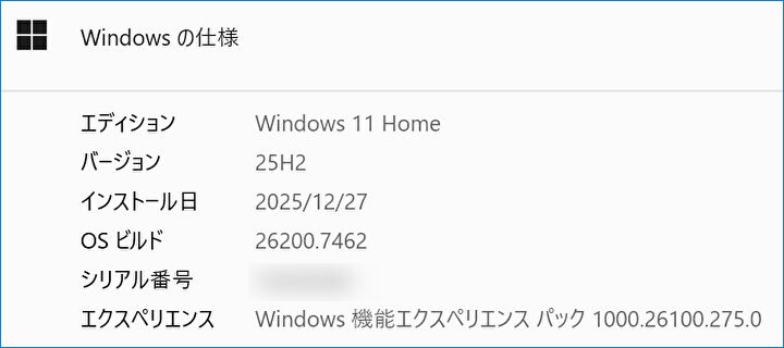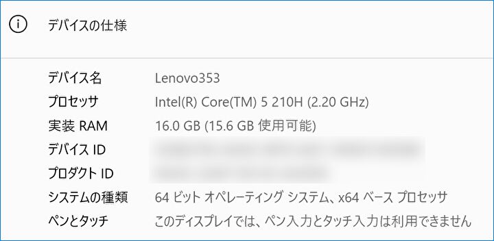 ▼Windows 11「設定」の「デバイスの仕様」と「Windowsの仕様」より。もちろん、製品仕様どおりの、Core 5 210H、メモリ 16GB、Windows 11 Homeです。