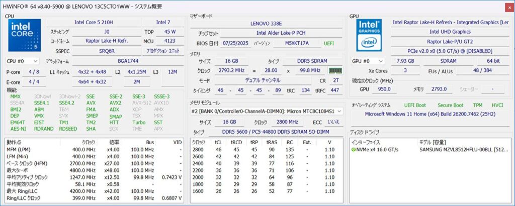 なお、2026年1月30日現在の直販ストアでは Core i5-13420Hをメインとして販売されていることもあり、比較対象は所有するPCのうち 近いところで、以下のCore i5-13500H(Pコア 4 Eコア 8の合計12コア 16スレッド)としています。