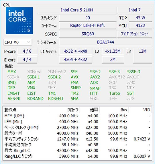 ▼上の画像からCPUの情報を拡大。Core 5 210Hは Pコア 4 Eコア4の合計8コア 12スレッド、TDP 45W、L3 キャッシュ 12MBです。
