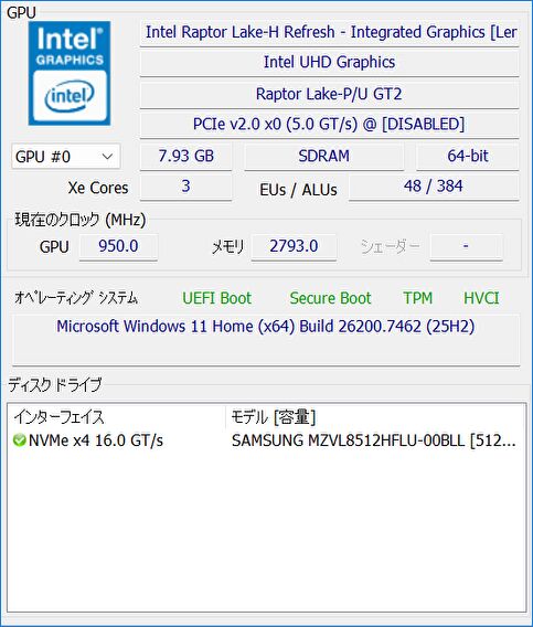 ▼GPUは統合型のIntel USD Graphics。後段のベンチマークで掲載していますが、統合型グラフィックスでもあり、ゲーミングベンチマークのスコアは高くないです。
