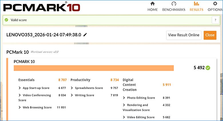 PCMark 10のスコアは5,492。オフィスワーク向けのシステム推奨の目安は「Productivity = 4,500以上」ですが、8,734と大きく上回っています。一方、「Digital Content Creation」は、ミドルレンジのAMD Ryzen 5 7640HSと比較してもやや低いスコアです。