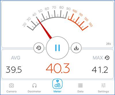 ▼こちらは iPhone アプリ「デジベル X」にて計測の、CPU使用率を100%とした際のファン音量です。平均 40dB弱と、やや喧しいと感じるレベルですが、負荷を下げると即静音(ほぼ気にならない)となるため、CPU温度と同様に許容範囲との認識です。