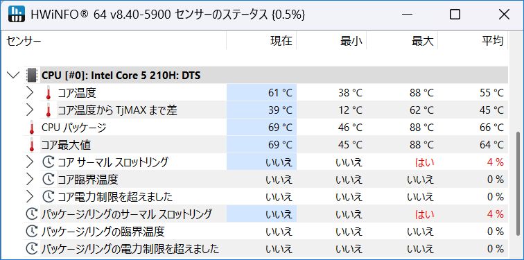 ▼フリーソフト「HWiNFO」で計測の、負荷をかけた際のCPU温度です。普段使いを含めた平均は低くおさまっていますが、CPU使用率を100%とした際には、サーマルスロットリングが発動したこともあります。ただし、これほど CPU使用率を上げることはないため、許容範囲との認識です。