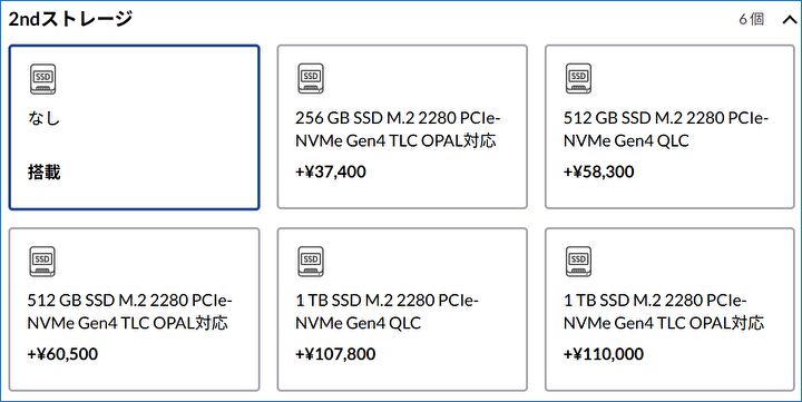 | ストレージ | 2280サイズ M.2 PCIe SSD TLC 512GB、 M.2 空きスロットあり |
