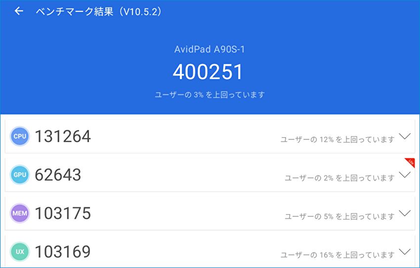 ▼以下は、同じくHelio G99を搭載する「Avidpad A90S」にて計測の、AnTuTu ベンチマーク v10のスコアです。Helio G99のスコアは他製品も含めて 概ね 40万前後となり、普段使いではサクサクと動作します。