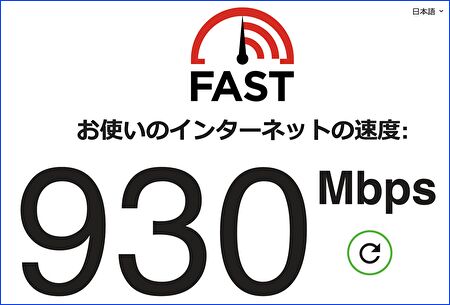 M4 Mac miniのRJ45ポートは2.5Gbではなく 1Gb。このため、FASTでの計測は以下の900Mbps台です。M4 Mac miniの購入時に、オプションで10Gbも選択できるため、私が今 M4 Mac miniを購入する場合には10Gbを選択します。