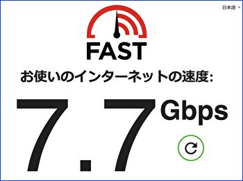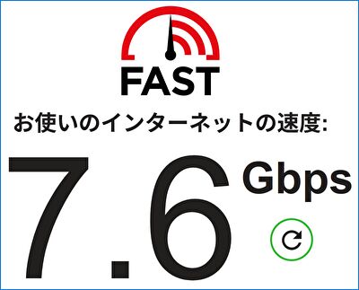 以下のFASTの結果のとおり7Gbps台、計測中に8Gbps台となることもあります。同アダプターの動作をWindows 11とUbuntuのPCにおいても確認していますが(Ubuntuにて常用)、Windows 11では M4 Mac miniと同水準、UbuntuのPCでは 5Gbps前後の速度です。