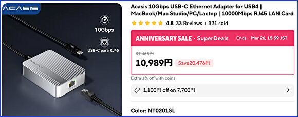 国内通販においても、数種類の10Gbps USB-C to RJ45 アダプターが販売されています。おそらくはどの製品においても熱の懸念のある10Gbps USB-C to RJ45 アダプターですが、ヒートシンクが大きめのAcasisの製品が たまたまアリエクにてセールを行なっており、以下の製品を購入しました。他の製品も同様かと思いますが、注意事項は以下の3点です。
