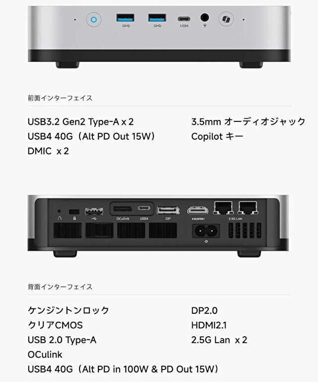 | ポート類 | USB4 x 2、USB-A 3.2 Gen 2 x 2、USB-A 2.0、HDMI、DisplayPort、2.5G 有線LAN x 2、OCulink(ホットスワップ 未対応) |