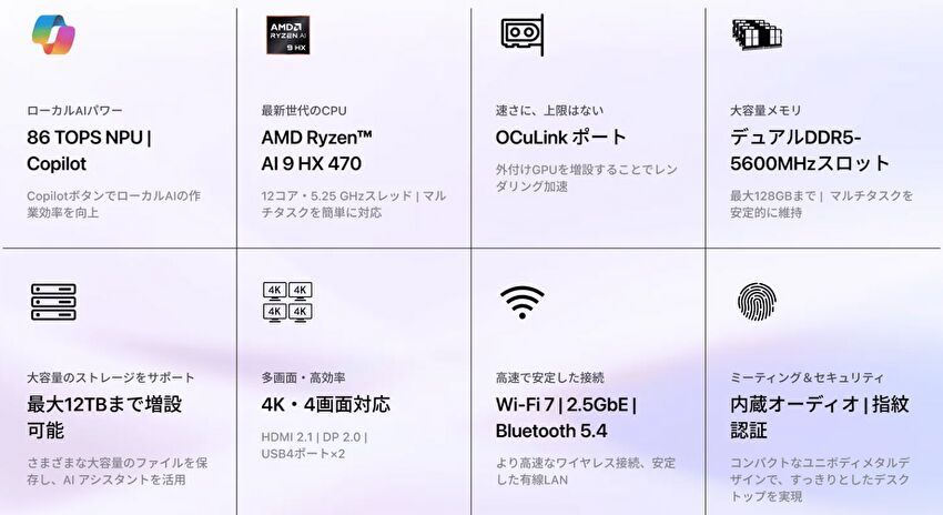 | ポート類 | USB4、USB-A 3.2、HDMI、DisplayPort、2.5G 有線LAN x 2、OCulink(ホットスワップ 未対応) |