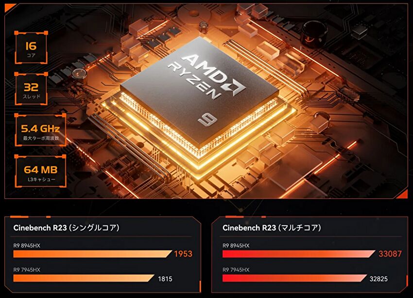 | CPU | AMD Ryzen 9 8945HX、16コア 32スレッド、64MB L3キャッシュ、最大 5.4GHz |