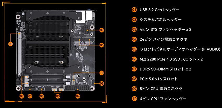 ▼Mini-ITXのマザーボードであることを踏まえても、ヘッダーも含めた拡張性は控えめです。前述のとおり、特にSATA ポート、USB-C ヘッダー、RGB ヘッダーを未装備であることに留意ください。