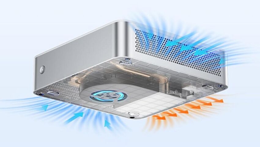 ▼冷却は、サイドと底面から冷気を取り込み、ポート類のある背面から排出する仕様です。MINISFORUMのミニPCでは、CPUファンのほかに メモリとSSD冷却用のシステムファンを装備していることが多いのですが、本製品はCPUファンのみです。
