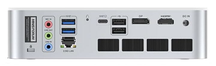 ▲ポート類は背面に集中していますが、映像出力は Alt DPに対応のUSB-C、HDMI、DPの3系統、USB-Aを4ポート装備しています。また、ミニPCとしては珍しく、LINE IN/OUT、MIC INを備えています。なお、このクラスのPCとなると、USB4を装備する製品も多いなか、本製品はフル機能のUSB-Cどまりです。