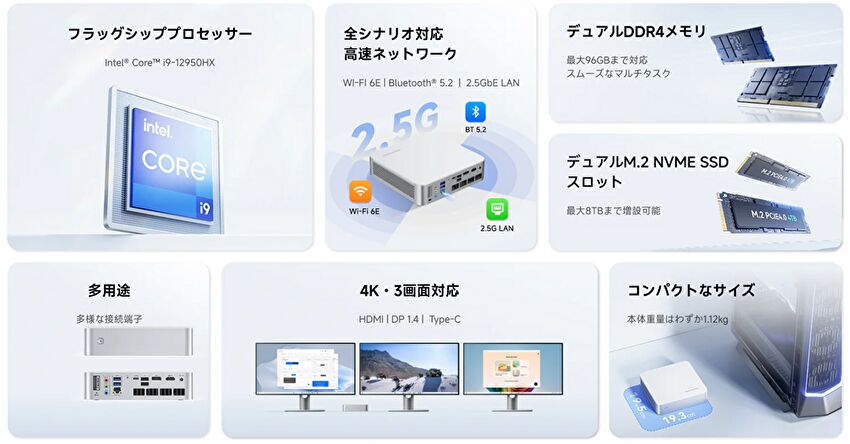 MINISFORUMより、CPUにCore i9-12950HXを搭載するPC「MINISFORUM M1-1295」が販売されていますので、スペックについて記載します。M1,M2 Mac miniに近い縦横のサイズに、メモリ 2スロット、M.2 SSD 2スロットの一般的なミニPCと概ね同様の構成ですが、公式サイトを参照すると、そのデザインからオフィス向けを意識していると思われます。