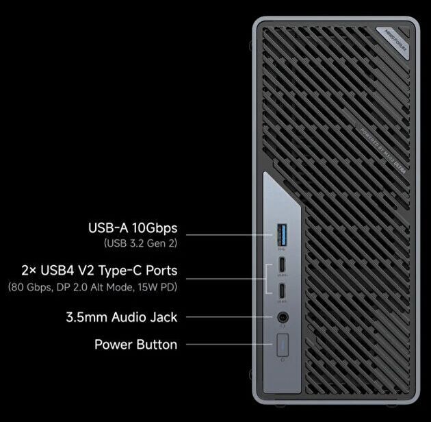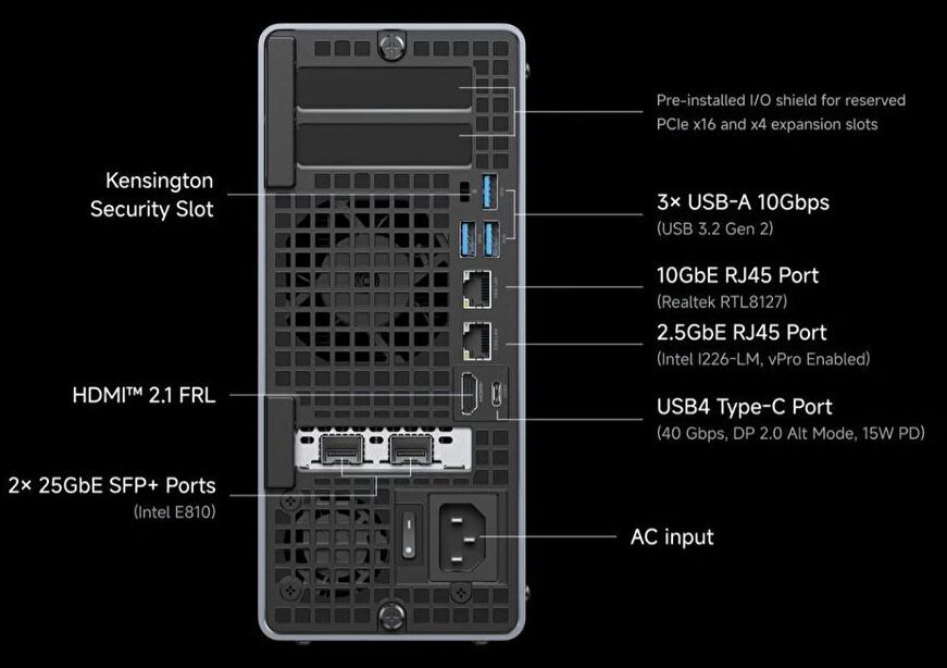 ▲▼前面と背面に 80GbpsのUSB4 V2ポートを装備し、背面のUSB4とHDMIと合わせて、映像出力は4系統です。また、25GbE SFP+を2ポート 搭載することも大きな特徴です。