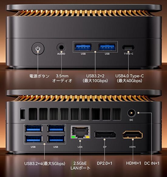 | ポート類 | USB4、USB-A 3.2 Gen 2 x 2、USB-A 3.2 Gen 1 x 4、HDMI、DisplayPort、2.5G RJ45 有線LAN、3.5mm イヤフォンジャック |
