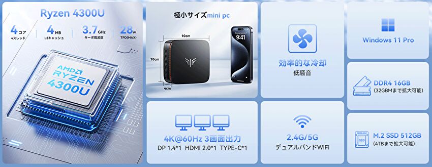 AMD Ryzen 3 4300U、メモリ 16GBを搭載のミニPCが 30,970円で販売中。N150より優位で、2.5G LANを2ポート搭載